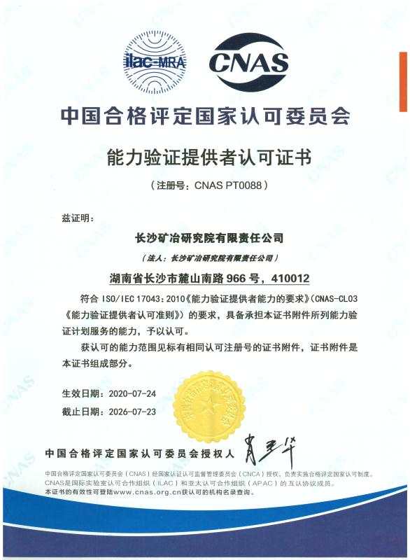 長礦檢測公司是目前湖南省唯一一家中國合格評定國家認可委員會(CNAS)認可的能力驗證提供者(證書編號:CNAS PT0088),資質范圍涵蓋礦石、鋰電材料、土壤、水樣、鋼鐵合金測試等多個領域,可提供氫氧化鎳鈷錳、鎳鈷錳酸鋰、碳酸鋰、鐵礦石、銅鉛鋅礦等十余種產品的化學成分及粒度與比表面測試能力驗證和測量審核服務。