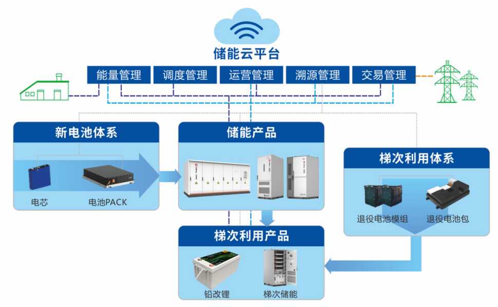 構建“三款產(chǎn)品、兩套體系、一個平臺”業(yè)態(tài),不斷攻克儲能與梯次利用關鍵技術,實現(xiàn)儲能產(chǎn)品全生命周期數(shù)字化管理,建設從電池—梯次利用—電池材料的低碳循環(huán)產(chǎn)業(yè)鏈。
