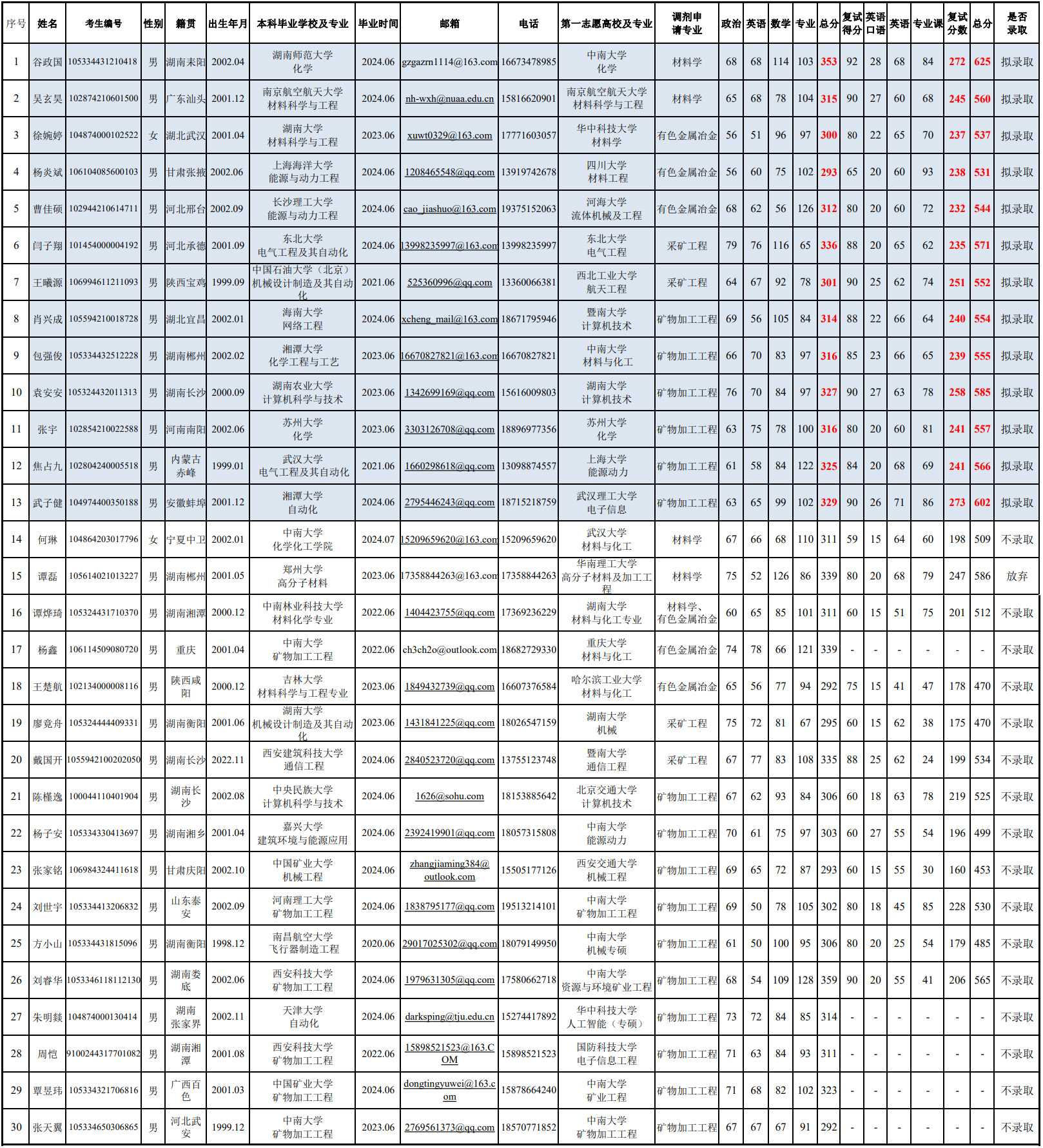 長沙礦冶研究院2024年擬錄取碩士研究生公示名單